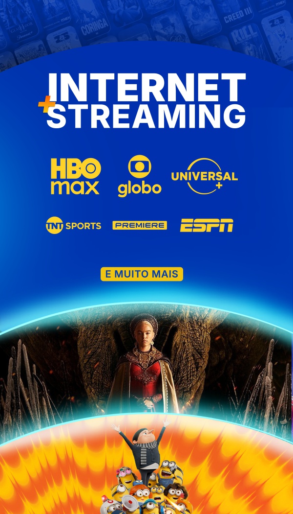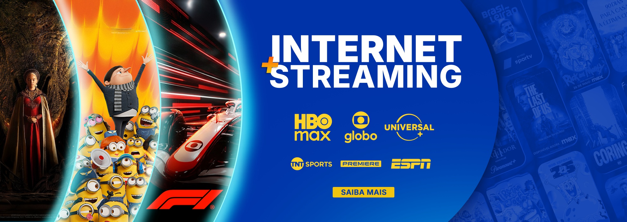 Instalação Grátis. *Wi-Fi 6 em comodato, somente para novas contratações. Download 950 Mega. Upload 950 Mega. * Plano de Internet Fibra Ótica pré-pago, exclusivo para novas contratações em áreas urbanas, com uso residencial para até 6 dispositivos simultâneos. Inclui acesso ao Watch, serviço de streaming próprio, com 8 perfis e até 4 telas simultâneas, além de HBO Max, com 4 perfis e até 2 telas simultâneas. *Planos e valores diferenciados para empresas e áreas rurais com ativação sob consulta de viabilidade técnica conforme projeto e demais condições no ato da contratação. *Plano com acesso: Canais ao vivo- Acelerados, Agro+, Aparecida, Arte1, Band, BandSports, BandNews, Canal Artesanato, Canção Nova, CNN Brasil, Desimpedidos, Fit Dance, Futura, Gazeta, GE TV, GE TV 2, Good Game TV, Globo Inter TV, Manual do Mundo, New Brasil, Record TV, Record News, RedeTV!, Rede Vida, Sabor & Arte, SBT, TV Cultura, Será, Terraviva, TV Brasil, Whe Play, TV Rá-Tim-Bum, BM&C News, Times Brasil CNBC, DreamWorks, Dum Dum, E!, Film & Arts, GloboNews, Globoplay Novelas, Gloobinho, Gloob, GNT, JP News, Megapix, Modo Viagem, Moonbug, Multishow, N Sports, Off, SporTV, SporTV 2, SporTV 3, Studio Universal, Universal Premiere, Universal Reality, Universal TV, USA, Whe, AMC. Watch Streming - Mais de 30 mil horas de conteúdo, incluindo filmes, séries e desenhos. Filmes - Telecine Premium, Telecine Action, Telecine Fun, Telecine Pipoca, Telecine Touch e Telecine Cult. Universal+ - Filmes e séries da franquia. MAX - Conteúdos da HBO, Discovery, Cartoon Network, TNT Sports, DC, Discovery Home & Health, Harry Potter, Discovery Kids e Champions League. Aluguéis - Lionsgate. Valor: R$189,99 *Promoção não cumulativa com outras promoções. *A continuidade dos serviços (pré-pago) depende do pagamento em dia.