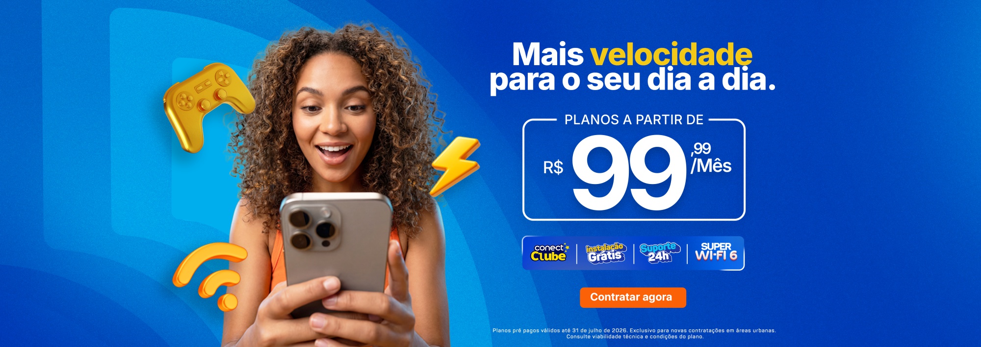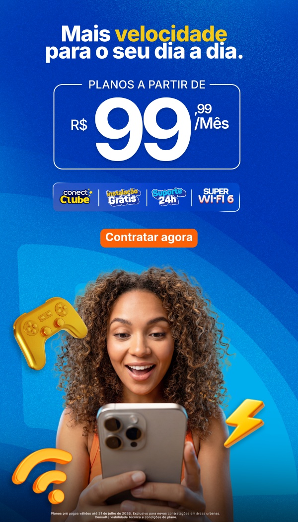 Instalação Grátis. *Wi-Fi 6 em comodato, somente para novas contratações. Download 950 Mega. Upload 950 Mega. *Planos de Internet Fibra Ótica, pré-pagos, exclusivos para novas contratações em áreas urbanas com uso residencial para até 10 dispositivos simultâneos. *Planos e valores diferenciados para empresas e áreas rurais com ativação sob consulta de viabilidade técnica conforme projeto e demais condições no ato da contratação. *Promoção não cumulativa com outras promoções.